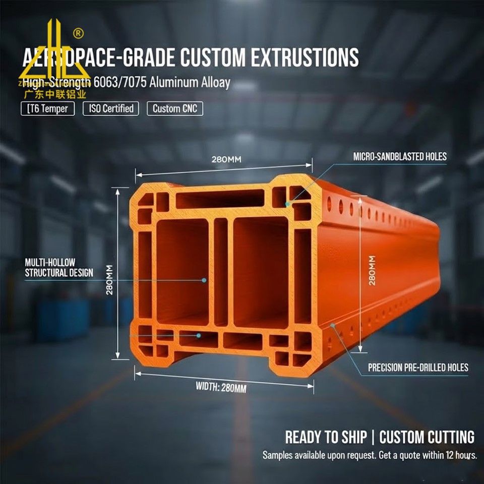 - Stopy lotnicze-: Dostępne w stopach 6063 (-odporność na korozję, estetyczne wykończenie) i 7075 (stan T6, ekstremalna wytrzymałość konstrukcyjna) nasze profile spełniają standardy lotnicze w zakresie trwałości i niezawodności.